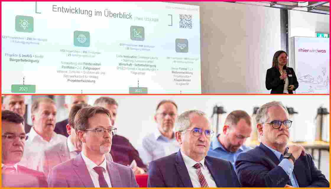 Wir durften unsere Arbeit, ebenso wie weitere aus dem Bundesprogramm STARK geförderte Projektträger, vor einem großen Publikum und versammelter Presse der Öffentlichkeit vorstellen. Mit uns dabei waren über 100 Strukturentwickler aus Wissenschaft, Forschung, dem Sozialen Bereich, der Wirtschaft und den Ministerien, um nach knapp drei Jahren erste STARK-Bilanz zu ziehen. Der Sächsische Staatsminister für Regionalentwicklung, Thomas Schmidt und Dr. Raphael XX vom MInisterium KLIMA sowie Jörg Huntemann, BEauftragter strukturwandel ... saßen in der ersten Reihe.