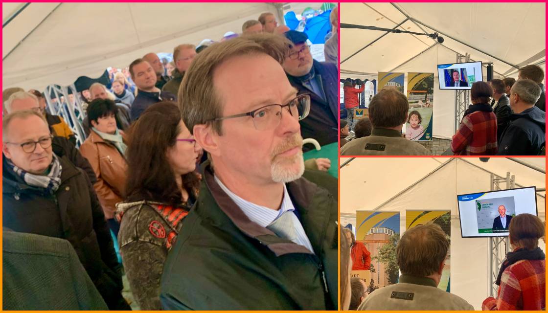 Dass sich die Bürgerinnen und Bürger auf den Bahnhof, der Ende 2024 fertig umgestaltet sein soll, freuen, war an der Resonanz auf den Baustellenstart ersichtlich. Gegen 14 Uhr strömten immer mehr Interessierte, gewappnet mit Schirmen und Regencapes, zum Festzelt auf dem Bahnhofsvorplatz. Hier stimmten sie sich mit live gespieltem Klavierkonzert, festlichen Videoansprachen von MP Michael Kretschmer und Landrat Dr. Stephan Meyer und einer bewegenden Ansprache von OB Torsten Pötzsch gemeinsam auf den Baustart ein. Landrat Dr. Meyer betonte erneut, dass er sich über den bedeutenden Baustart freue und weiterhin „hoffe, dass Weißwasser bald ein Schnellzug-Bahnhof" werde. Doch zunächst stand anderes, erfreuliches an! Der feierliche "Anstoß":